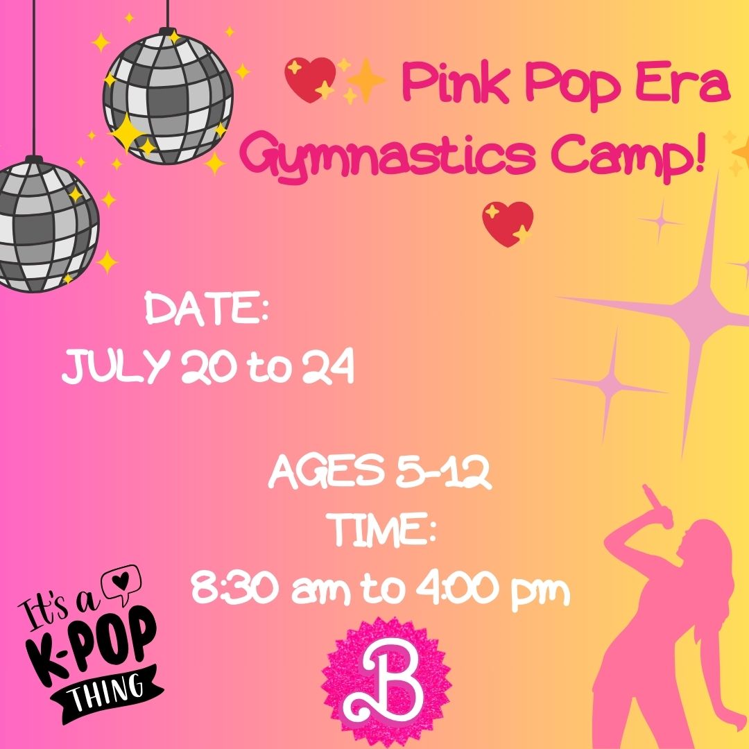 Step into your main-character era at our Pink Pop Era Gymnastics Camp! Inspired by the energy of K-Pop Demon Hunters, the sparkle of Taylor Swift, and the bold fun of Barbie, this camp is all about confidence, creativity, and cool moves. Campers will flip and tumble to pop-star vibes, strike powerful poses, and express themselves through themed games, dance, and glam crafts.